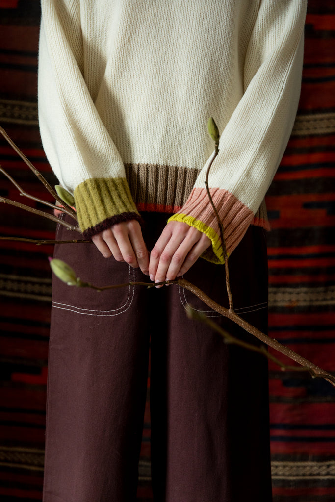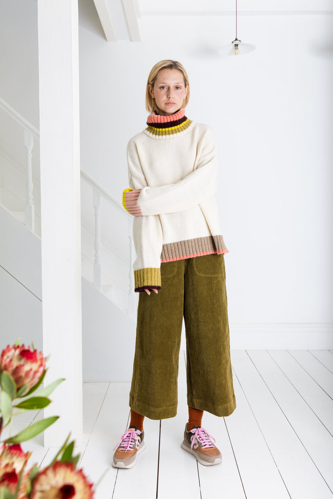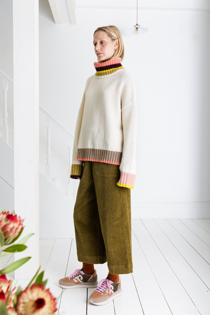 The Bonté Bailey Jumper in Winter White Multi merges classic and contemporary design with its timeless roll neck and eye-catching striped collar. Crafted from responsibly sourced yarn, it offers warmth and sustainability. Its relaxed, oversized silhouette enhances comfort during colder months, while the contrast trim at the hem, cuffs, and neckline adds a refined touch of colour. Designed for versatility, this jumper can also be sized down for a more fitted look, making it a sophisticated essential for your cold-weather wardrobe.