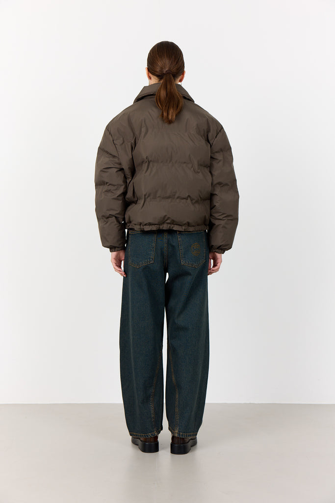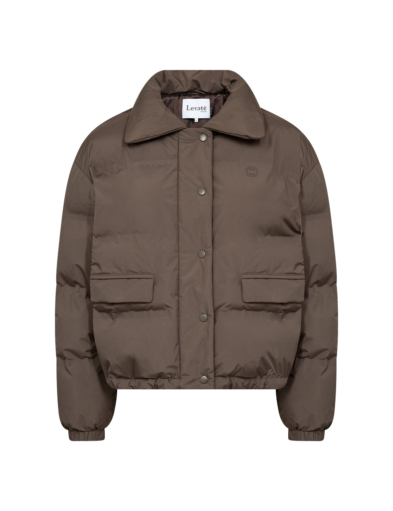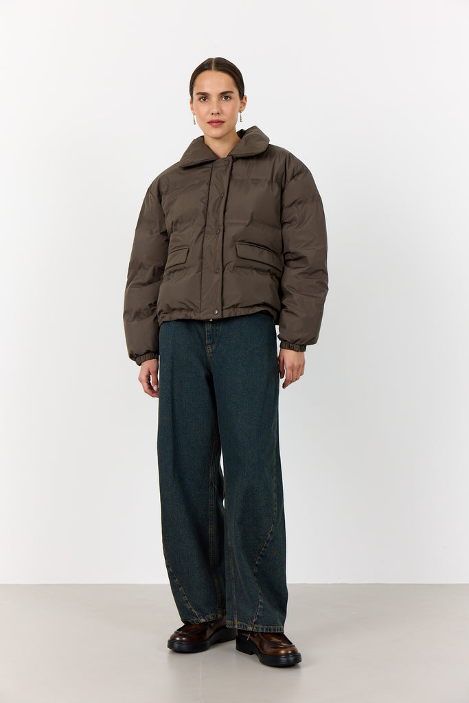 The Levete Room Mona 1 Jacket in Coffee offers cozy warmth with its 100% polyester, puffy design. Its high, wide collar and front button closure provide both style and protection against the elements. Practical features include spacious pockets and adjustable drawstrings at the hem for a customized fit. This versatile jacket effortlessly complements jeans for casual outings or tailored trousers for a polished appearance.
