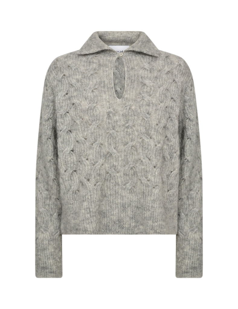 The Levete Room Niva 1 Pullover in Light Grey combines luxurious softness with practical comfort, made from a blend of 50% mohair, 32% wool, 16% polyamide, and 2% elastane. Its classic polo collar and distinctive keyhole closure enhance its refined cable-knit texture. Ideal for layering, this pullover pairs effortlessly with tailored trousers or a denim skirt, offering a versatile option for both relaxed daytime outings and elegant evening gatherings.