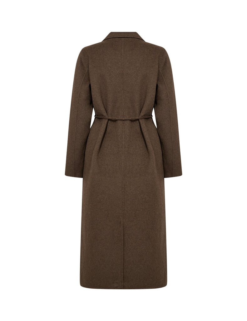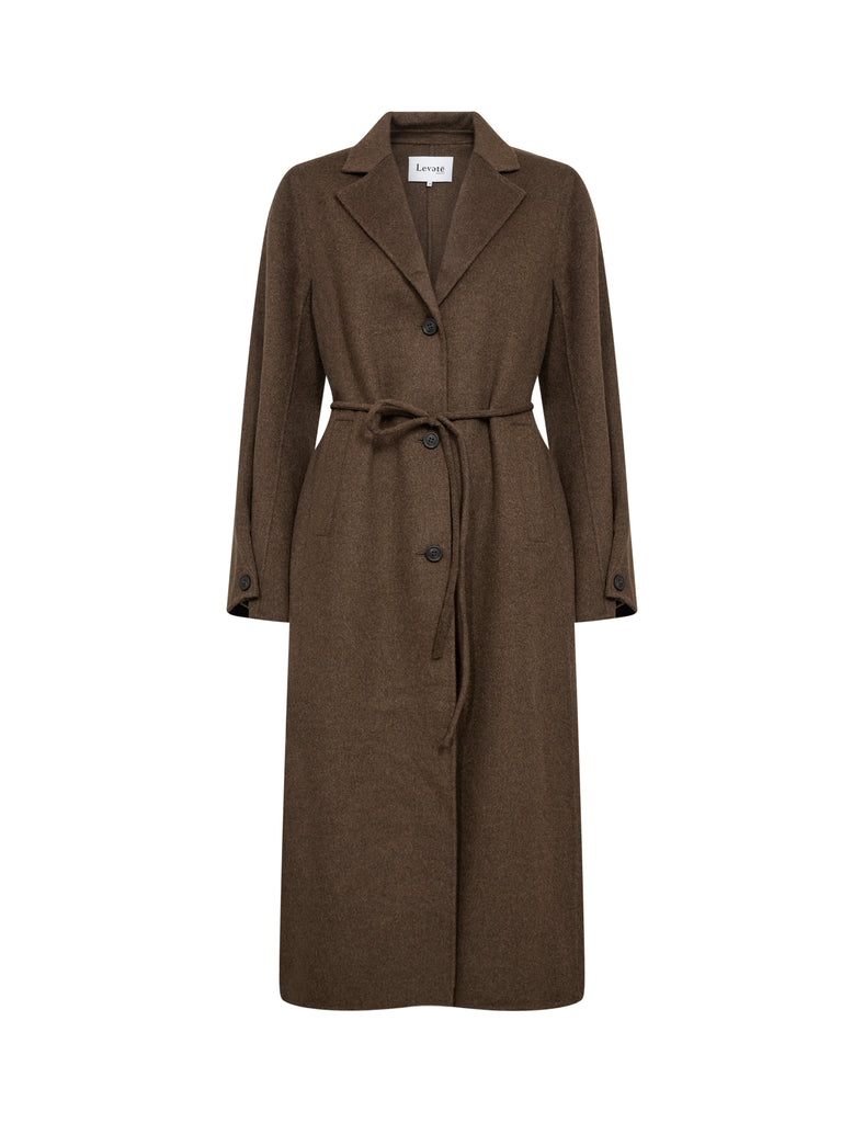 Crafted from a sustainable blend of 50% recycled wool, 30% polyester, and 20% viscose, the Levete Room Owa 33 Jacket in Coffee Melang offers both style and responsibility. Its notched lapel collar and button-down front provide a classic silhouette, while the belt cinches the waist for a tailored fit. Falling below the knees, this jacket elevates any outfit—ideal for pairing with tailored trousers or a casual dress for versatile wear.