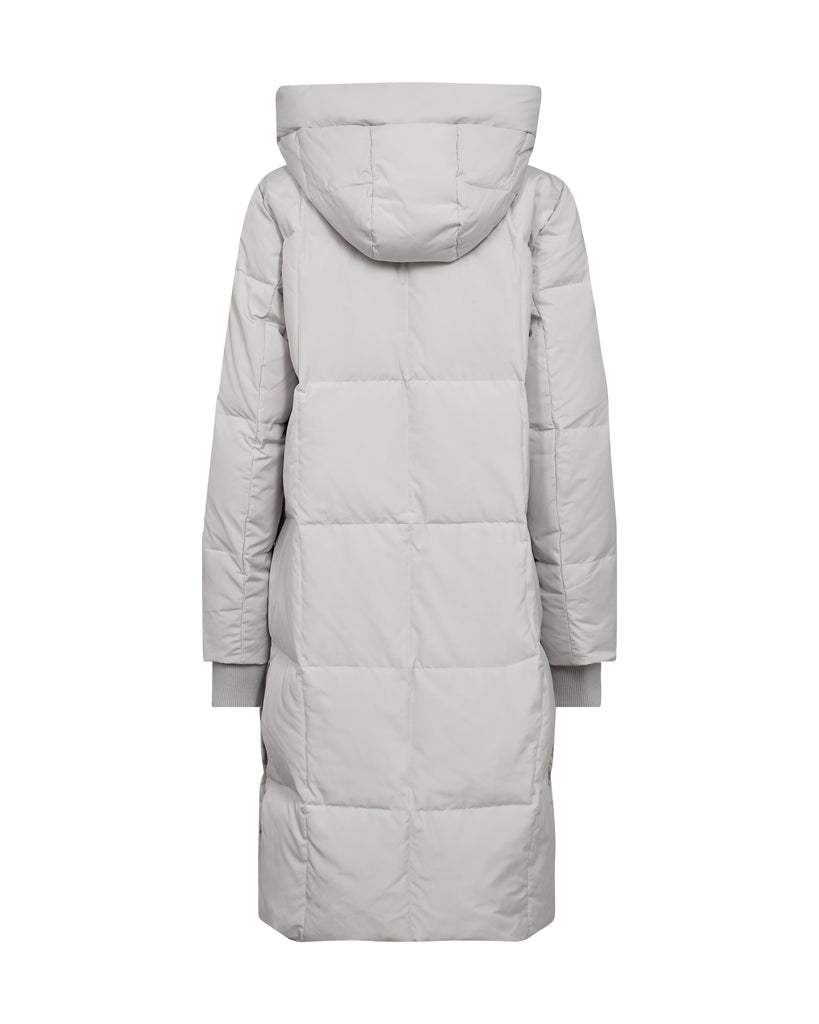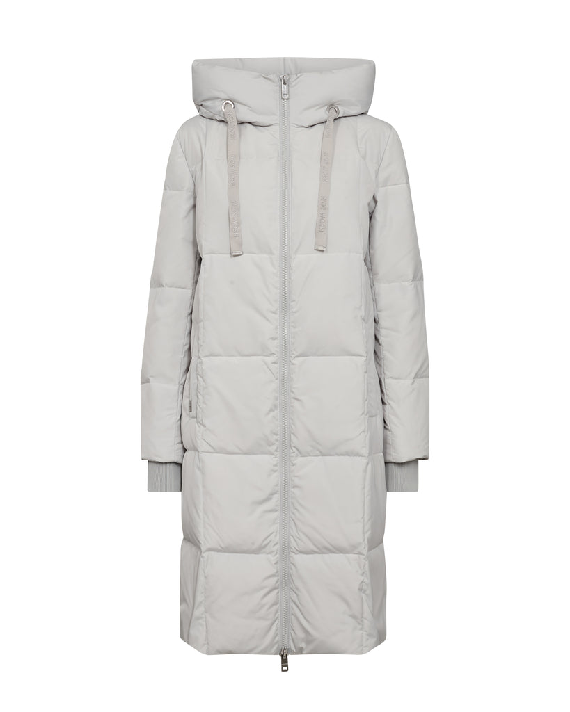 Mos Mosh Nova Square Down Coat in Glacier Grey Long light gray puffer coat with a hood on a white background