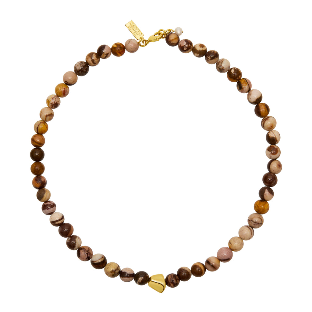 The Talis Chains Tokyo Choker in Latte combines natural stone beads with elegant freshwater pearls, all accented by durable 18-carat gold plating on brass for lasting shine. Measuring 40cm, this piece fastens securely with a lobster clasp and is thoughtfully presented in a drawstring linen pouch for safekeeping. Its refined materials and expert craftsmanship make it a sophisticated accessory suitable for both everyday wear and special occasions.