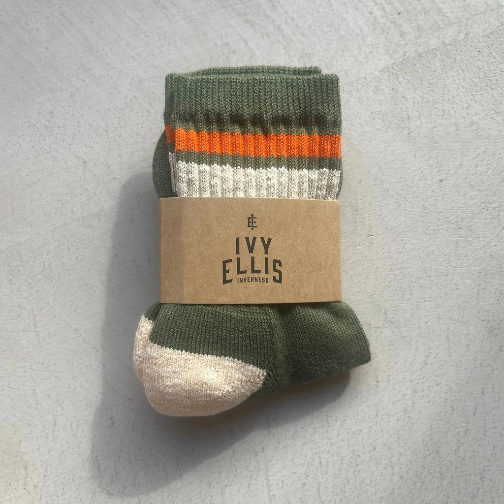 The Ivy Ellis Sven Women’s Cotton Sport Sock from the Pantheon Collection offers a refined balance of bold design and reliable comfort. Crafted from a cotton-rich blend, these quarter-length socks provide breathability and durability ideal for everyday wear. The deep green base is accented by distinctive orange and cream stripes, while ribbing ensures a secure fit that stays in place. Cream heel and toe details add subtle contrast, enhancing the sock’s classic yet vibrant aesthetic. Designed for women’s UK sizes 4-7 (US 6-9), these socks deliver expert comfort with lasting wearability.