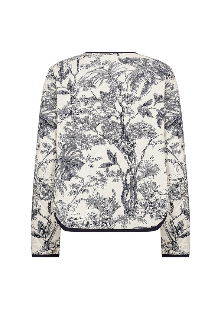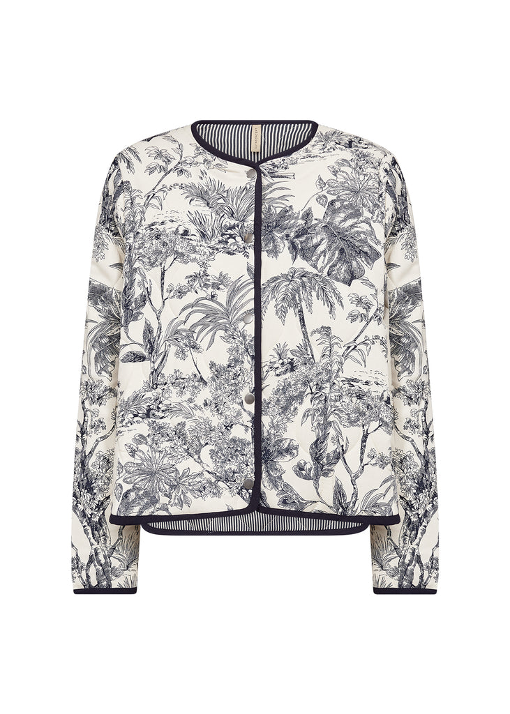 The SC-CARLI 3 jacket showcases sustainable style through its 100% LENZING™ ECOVERO™ Viscose construction, a responsibly sourced fabric that delivers exceptional softness and breathability. This versatile piece features a refined round neckline, functional front buttons, and an eye-catching botanical print enhanced by subtle quilted texture and striped edging details. The navy colourway offers sophisticated versatility—style with dark denim for understated elegance or pair with a skirt for contemporary contrast. Care is straightforward: gentle 30°C wash, low-temperature ironing, and air drying preserve the fabric's integrity and print quality. An investment piece that transitions effortlessly across seasons.