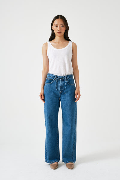 The Blake Jean is a low-rise, wide-leg jean with a self fabric tie for the ultimate relaxed style.