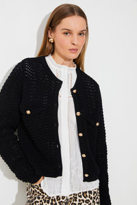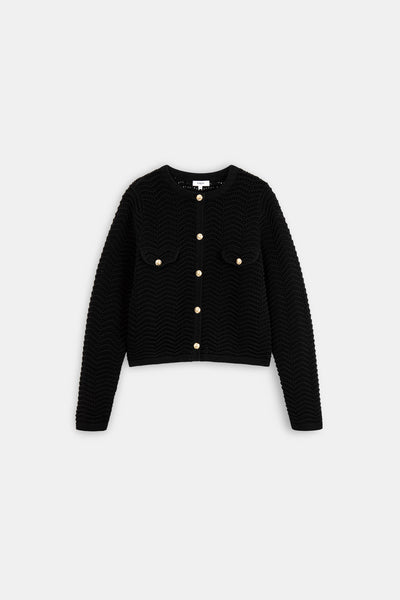 This expertly crafted Suncoo Giany Jacket in Black features a sleek, fancy design with elegant gold buttons and a front buttoned closing. With two decorative chest pockets and long sleeves, this jacket is both stylish and functional, making it a must-have addition to any wardrobe.