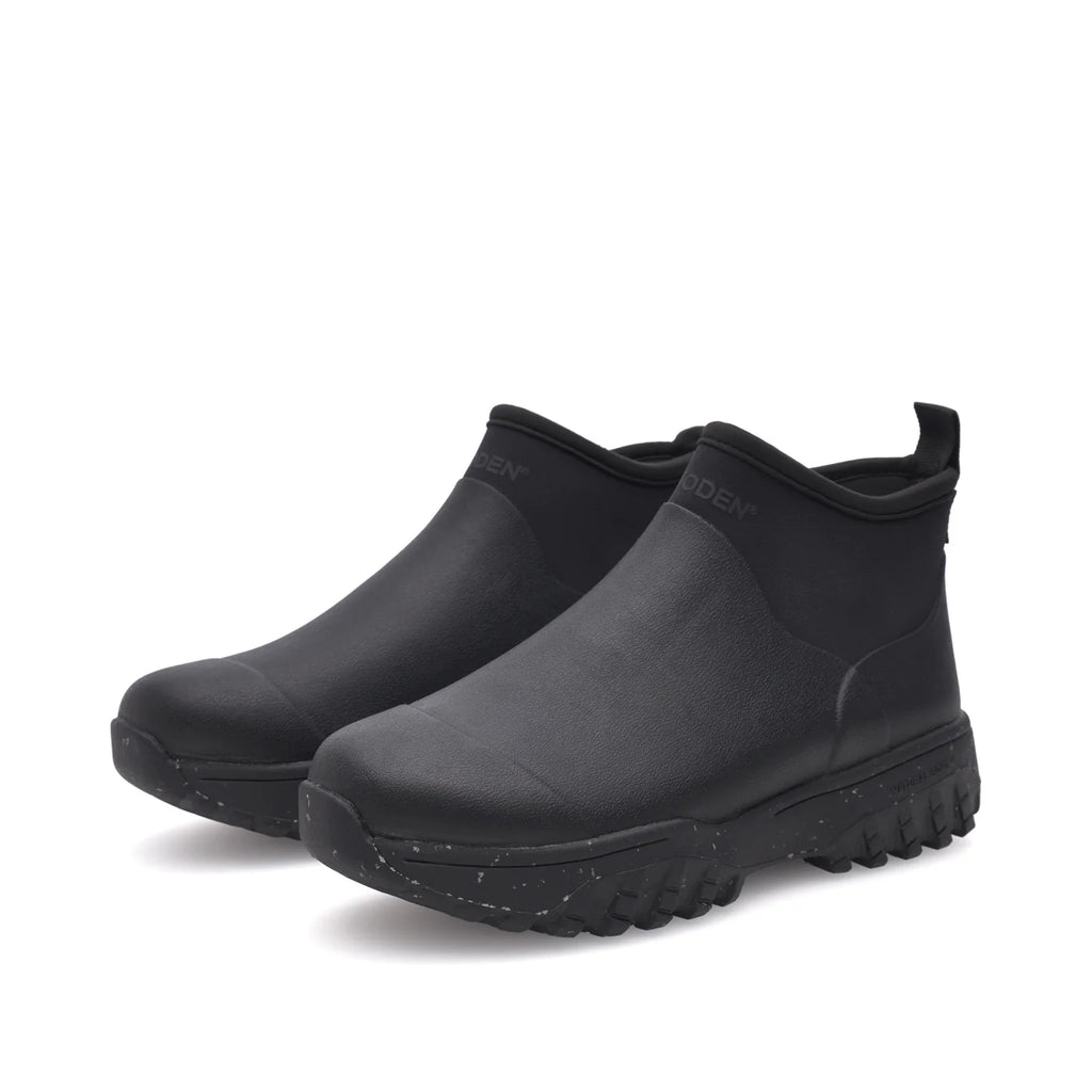 Introducing the Woden Irene Waterproof Boot in Black, crafted with vulcanized natural rubber for enhanced durability and a smooth, lightweight finish. Designed for an active, modern lifestyle, Irene offers superior comfort through its innovative Natural Soft technology outsole and a WODEN airflow cork insole. Fully waterproof with a rubber sole featuring a track pattern, it delivers reliable grip in wet conditions. The addition of a fish leather detail adds a unique touch, making Irene both functional and stylish for everyday wear.