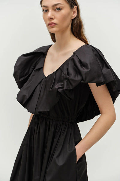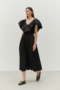 This black dress features elegant ruffles on the shoulders and neck, along with a flattering v-neck and back design. Made of 100% pure cotton, it measures 128cm in length and provides a comfortable and stylish fit. Perfect for any occasion, this dress is effortlessly chic and versatile.