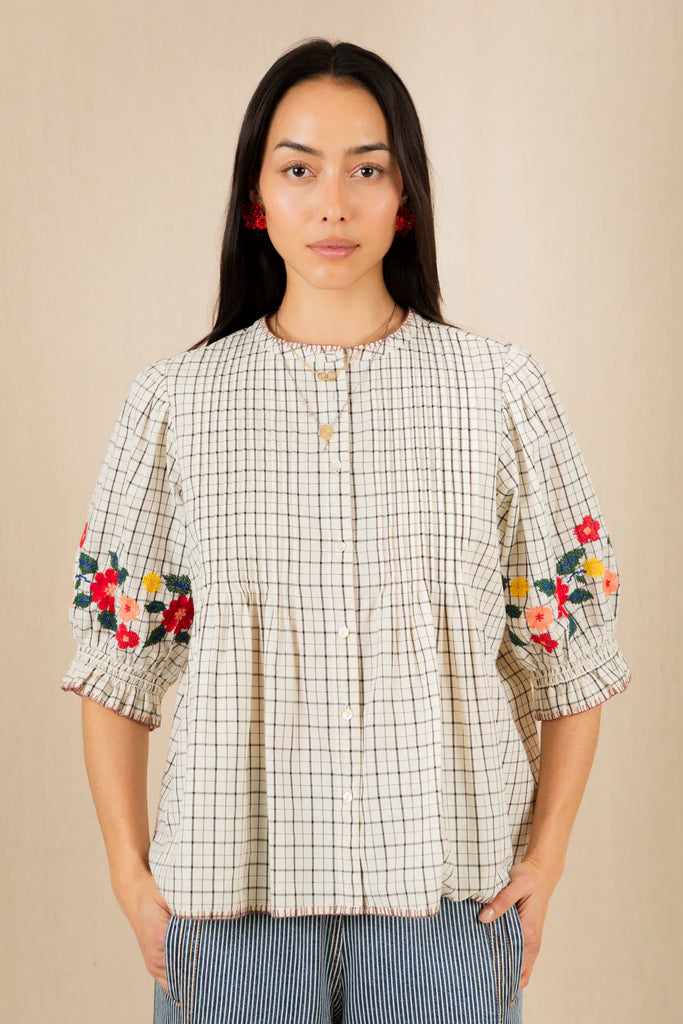 Discover understated elegance with this artisanal round neck shirt, crafted from 100% organic cotton in a printed check cambric. Fine pintuck detailing adorns the front, whilst elbow-length sleeves feature placement embroidery and smock-elasticated cuffs for refined comfort. Contrast blanket stitch edges the neckband, hem and cuffs, adding a distinctive handcrafted touch. Designed to be worn loose and relaxed, this versatile piece effortlessly transitions from casual to considered dressing.