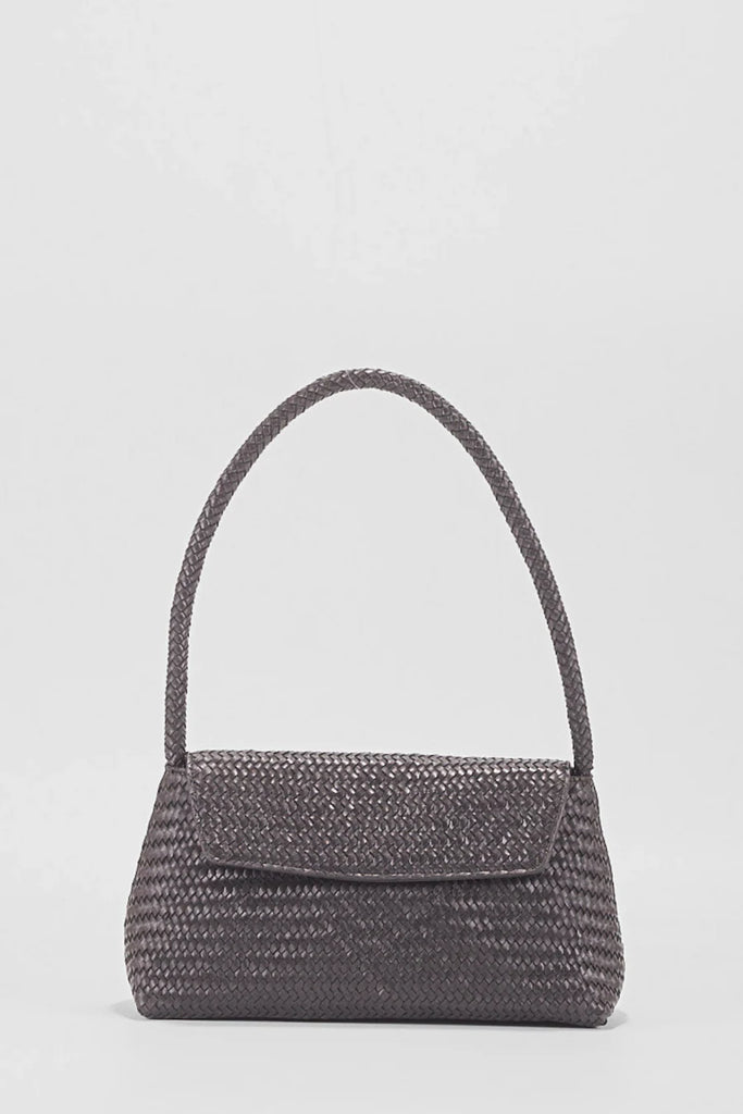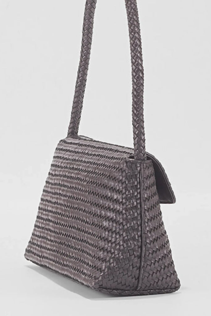 Ellyla Simi Woven Leather Baguette Bag in Black Gray woven handbag on a light gray background