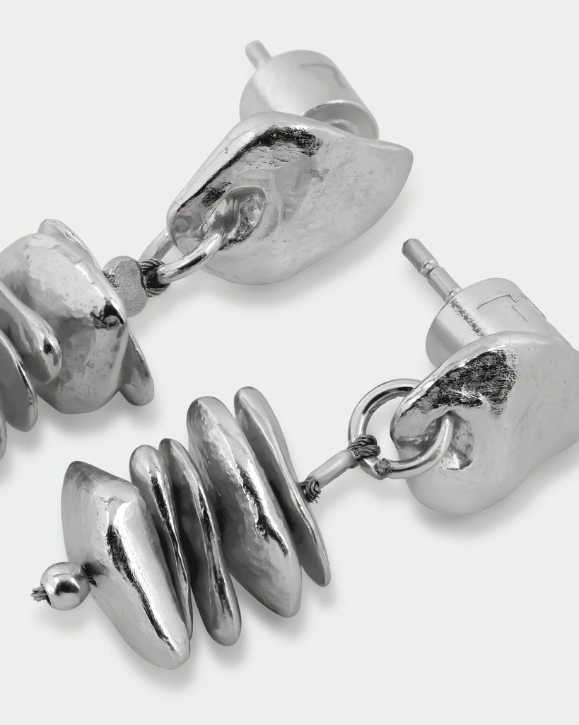 Elevate your everyday jewellery collection with these sophisticated Tutti Row Earrings in Silver. Featuring a distinctive multi-disc design, each earring showcases a harmonious blend of textured and polished finishes that catch the light beautifully. The organic composition creates visual depth and movement, while the carefully proportioned studs (1.2cm x 0.9cm) ensure comfortable all-day wear. Standing at 2.7cm in full height, these pieces strike the perfect balance between statement and wearability, making them an versatile addition to both casual and refined looks.