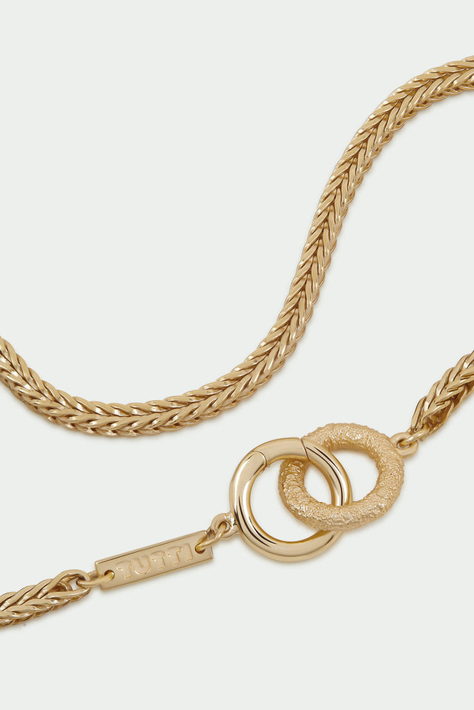 The Tutti Woven Necklace in Gold features an expertly crafted woven chain that combines refined elegance with practical versatility. A concealed clasp integrated into the pendant allows you to wear this piece with the focal point positioned at the front or reversed at the back, adapting effortlessly to your styling preferences. At 45cm in length, it offers a sophisticated drape suitable for layering or wearing as a standalone statement. The woven construction provides both durability and a distinctive textural quality that elevates any jewellery collection.