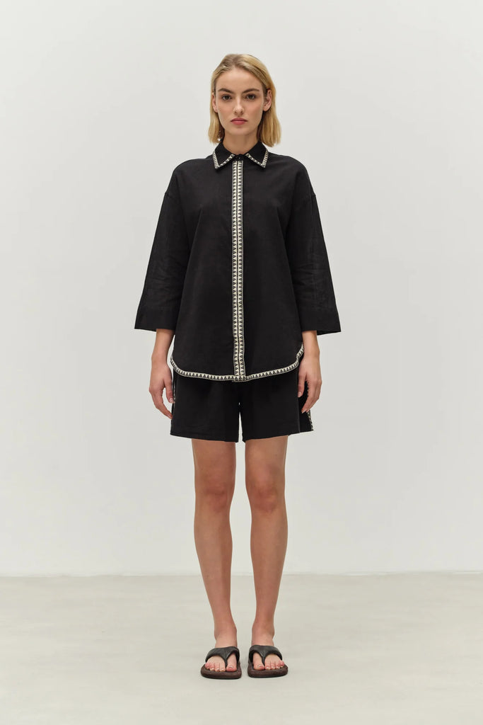 Introducing the Gaia shirt by Devotion Twins. Made from 100% cotton, it's perfect for warmer weather. With a pointed collar, concealed button closure, and shorter sleeves, it's both timeless and versatile. The straight cut and curved hem allow for easy tucking and draping, while jacquard-print trims add a touch of elegance.