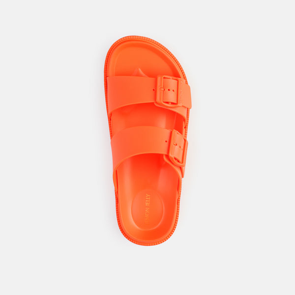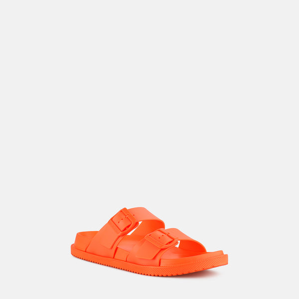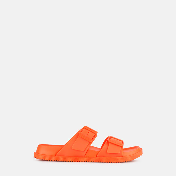 The Lemon Jelly Elise Sandals in Orange Peel are the perfect summer shoes. With their vibrant orange tone, these flat sandals will add a dash of fun to your everyday outfits. Designed to be both lightweight and vegan, they are the ideal companion for beach and pool days. Complete your summer look with our matching beach bags.