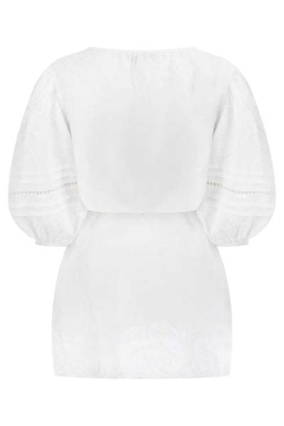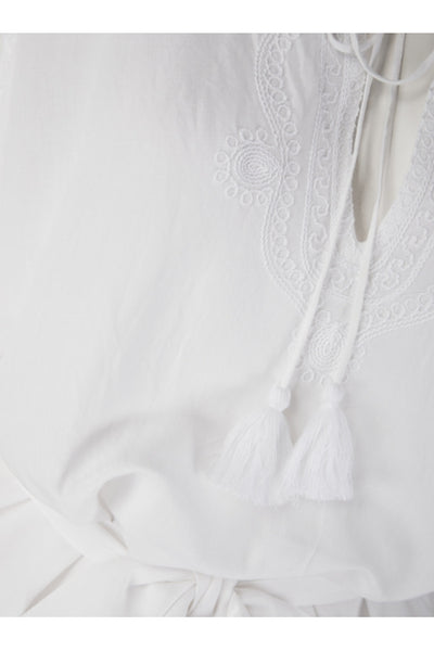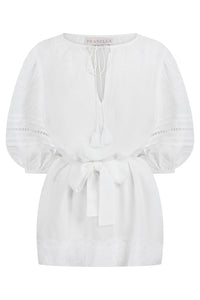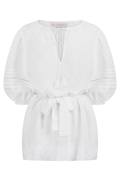 Elevate your summer look with Pranella's Carla dress. Made from high-quality linen and featuring a kaftan-style neckline with tassel ties, this white dress is perfect for any occasion. The voluminous balloon sleeves add a chic touch and make it easy to transition from day to night. Available in X-Small and 6-8 (UK) sizes.