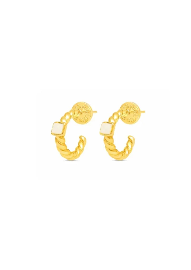 Elevate your everyday jewellery collection with our Everyday Twist Hoops, crafted from brass with luxurious 18 carat gold plating. Each hoop showcases a brilliant labrodite stone, delivering understated sophistication for any occasion. At just 2cm in diameter, these delicate hoops offer the perfect balance of presence and wearability. Layer them with our Baguette Hoops and Huggies for a textured, multi-piercing aesthetic. Each pair arrives in a premium drawstring linen pouch, ready to gift or treasure.